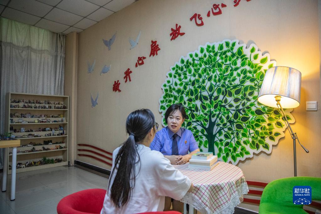9月20日,在重慶市大渡口區人民檢察院“莎姐”談心室內,梅玫與一名前來咨詢的未成年人談心。