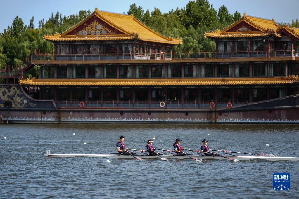 市民在位于北京市通州區的京杭大運河上進行賽艇比賽(2022年9月18日攝)。