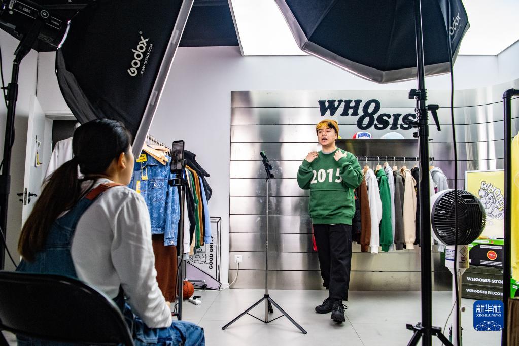 在重慶市渝中區由工業遺址改造成的“一廠影視園”一家國潮品牌公司內,創業者通過手機直播銷售商品(2022年9月27日攝)。