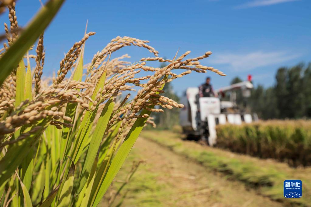 10月6日,農民在河北省唐山市海港經濟開發區王灘鎮駕駛收割機收獲水稻。