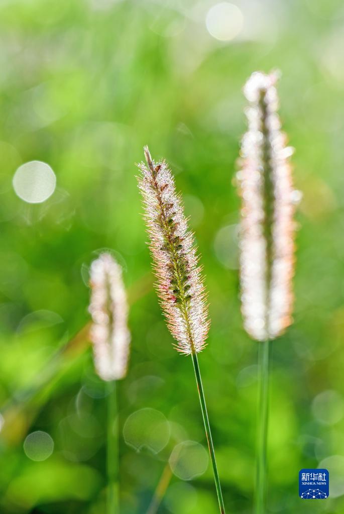 在廣西南寧市邕寧區,狗尾草上掛滿露珠(10月4日攝)。