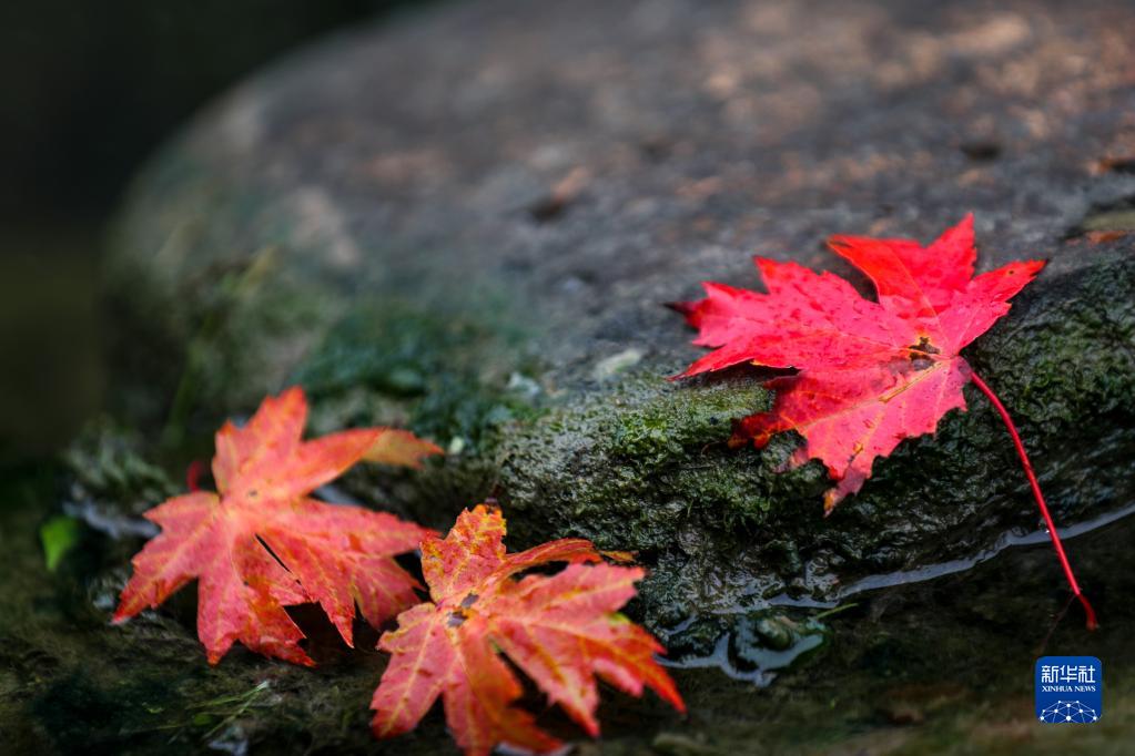 在江蘇省揚州市瘦西湖風景區,楓葉飄落(10月1日攝)。