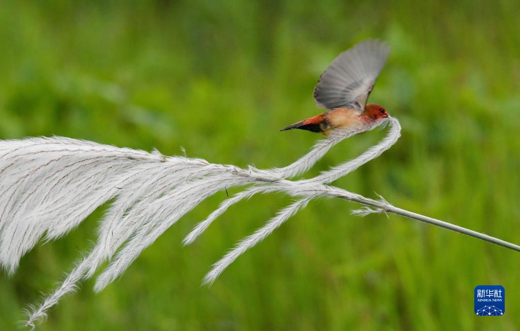 在云南省景洪市的山野間,紅梅花雀采集蘆花用來筑巢(9月25日攝)。