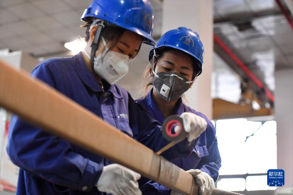 10月6日,在哈電集團哈爾濱電機廠有限責任公司的生產車間,楊萌(右)與同事配合作業。