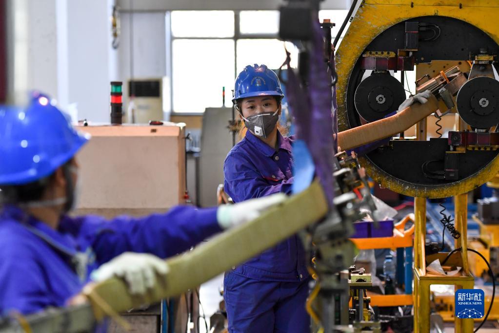 10月6日,在哈電集團哈爾濱電機廠有限責任公司的生產車間,楊萌(右)與同事配合作業。