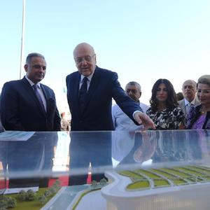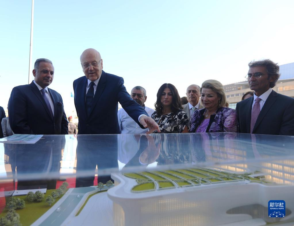 10月6日,黎巴嫩總理米卡提參觀首都貝魯特附近的中國援助黎巴嫩國家高等音樂學院項目,感謝中國政府在多方面給予黎巴嫩的幫助。這是米卡提(左二)觀看音樂學院建筑模型。