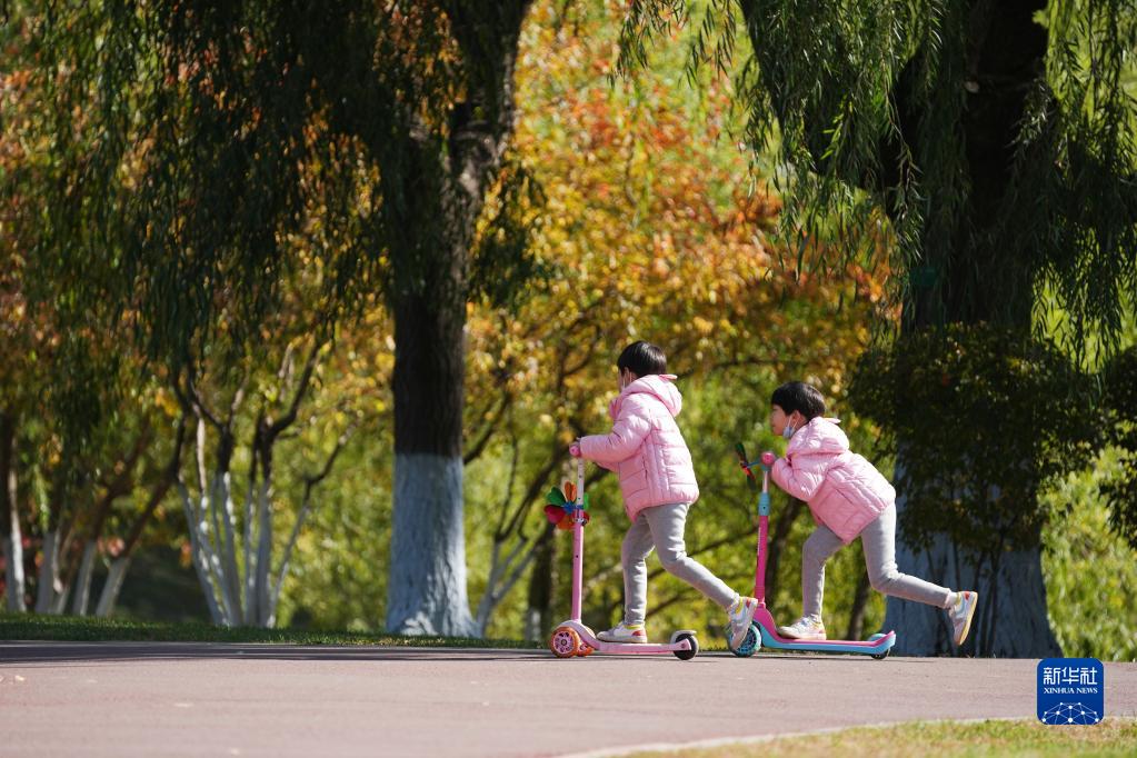 10月7日,小朋友在哈爾濱市湘江公園玩滑板車。