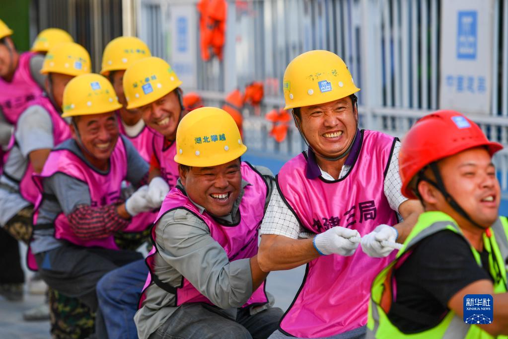 10月5日,濟南市唐冶(三甲)醫院工程項目現場,參與施工的中建三局集團有限公司(山東)建設者們進行工友趣味比賽,歡度國慶假期。