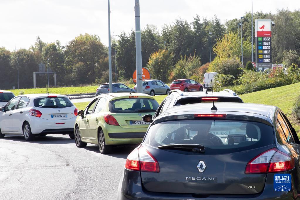 10月6日,在法國北部城市里爾,歐尚超市的加油站前車輛排起長隊。近日,法國道達爾集團旗下的許多加油站因燃油供應中斷而暫時關閉,導致其他加油站前排起長龍。