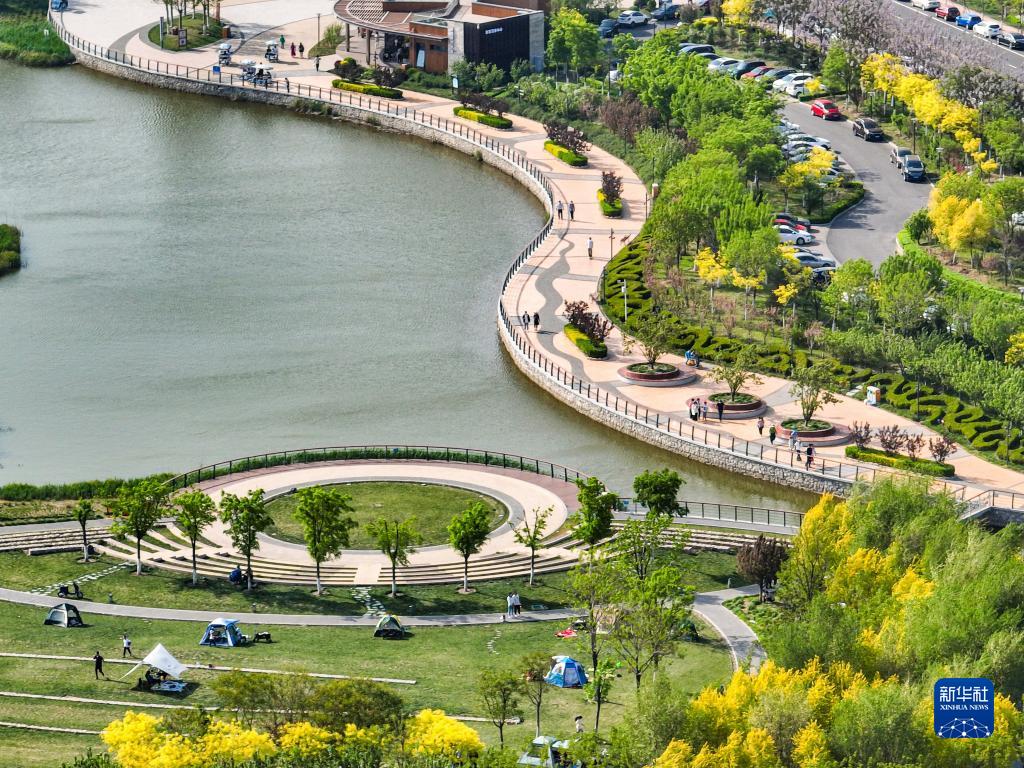 這是天津市濱海新區中新天津生態城南堤濱海步道公園一景(2022年4月24日攝,無人機照片)。