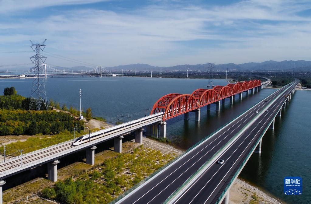 2022年9月25日,一列動車組列車從河北省懷來縣境內的京張高鐵跨官廳水庫特大橋上通過(無人機照片)。