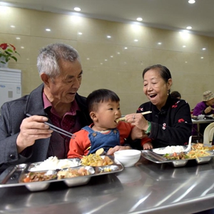 10月8日,安徽省合肥市蜀山區石油賓館助老餐廳內,蔣明珠(左一)和朱文秀(左三)兩位老人帶著自己的孫子就餐。