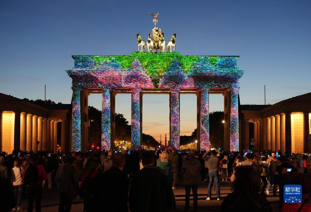 10月7日,德國柏林勃蘭登堡門被燈光點亮。柏林燈光節于10月7日至16日舉行。燈光節期間,柏林市內多個地標和建筑物將被燈光和裝置藝術品裝飾。新華社發(斯特凡·蔡茨攝)