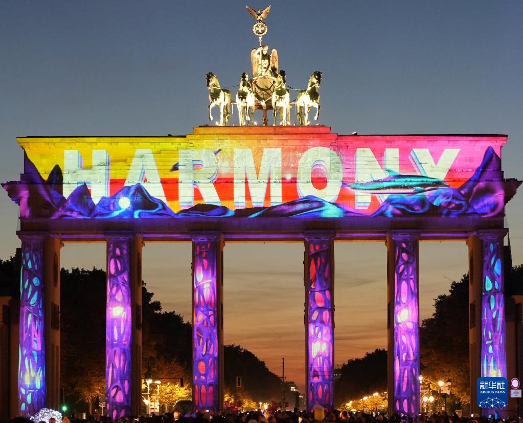 10月7日,德國柏林勃蘭登堡門被燈光點亮。新華社發(斯特凡·蔡茨攝)