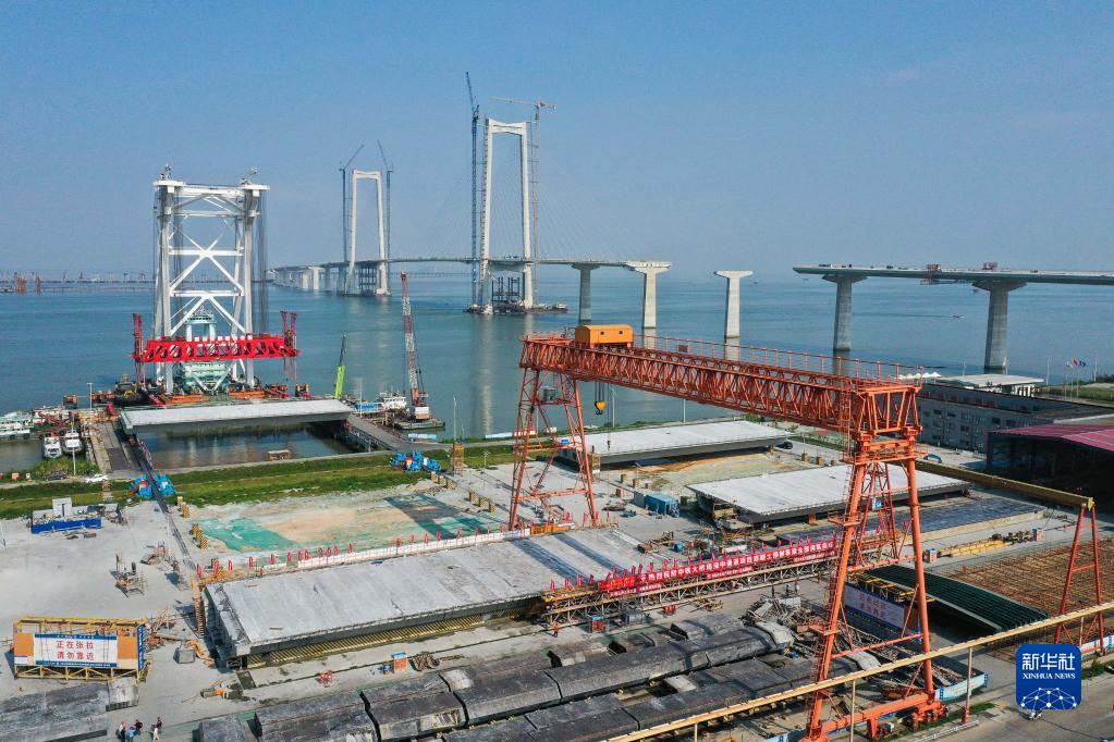 10月8日,深中通道中山智慧梁場的第155片60米混凝土箱梁完成預制(無人機照片)。新華社記者 劉大偉 攝