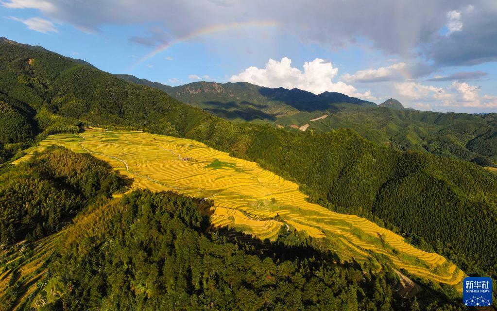 在廣東省清遠市連山壯族瑤族自治縣太保鎮歐家村,彩虹與金黃色的歐家梯田相映成趣(10月3日攝,無人機照片)。