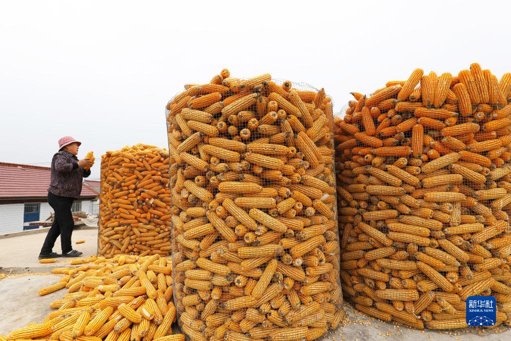 10月8日,在河北省唐山市豐潤區楊官林鎮破寺村,農民將收獲的玉米封囤歸倉。新華社發(朱大勇 攝)