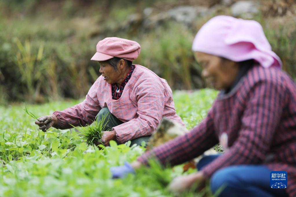 10月8日,村民在貴州省錦屏縣三江鎮烏坡村油菜育苗基地拔草。新華社發(楊曉海 攝)