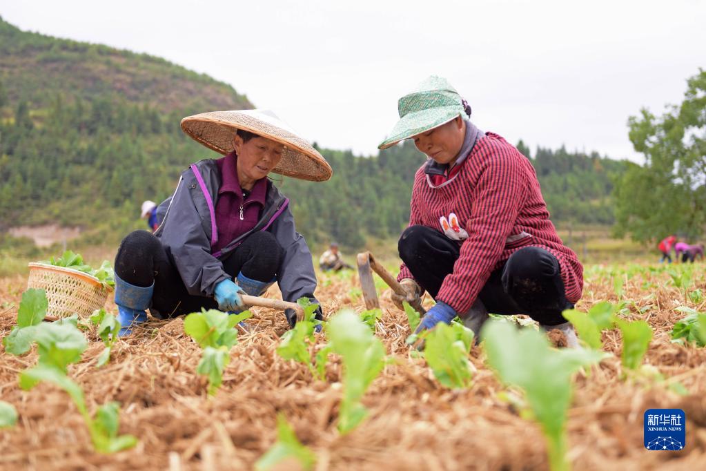 10月8日,村民在貴州省黔東南苗族侗族自治州岑鞏縣羊橋土家族鄉祝壩村移栽芥菜苗。新華社發(唐鵬 攝)