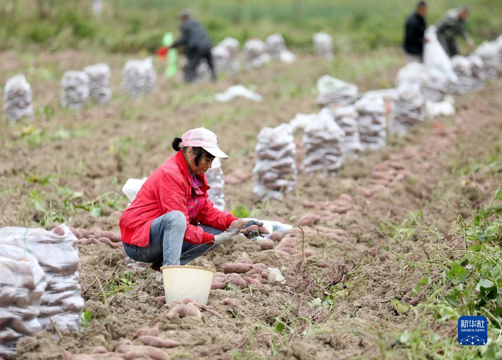 10月8日,在湖南省資興市唐洞街道程水村紫薯種植基地,村民在分揀紫薯。新華社發(李科 攝)