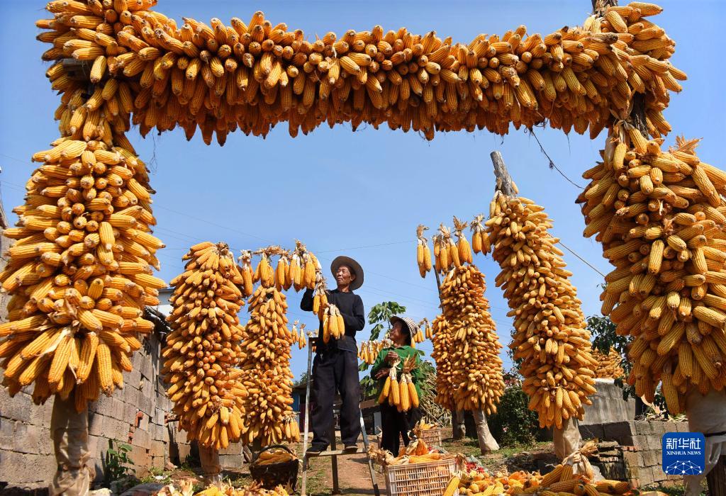 10月8日,山東省淄博市沂源縣西里鎮欣苗村農民在晾曬收獲的玉米。新華社發(趙東山 攝)