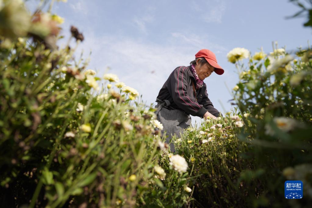10月8日,在河北省邢臺市內丘縣中馮村,村民在采收北京菊。新華社發(劉繼東 攝)