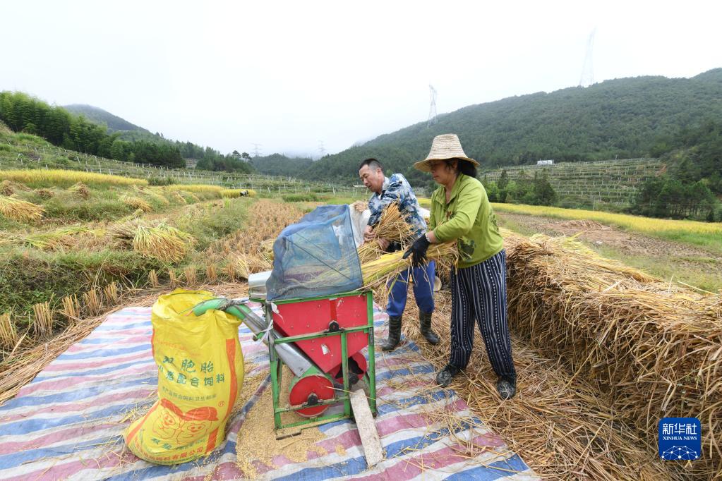 10月8日,在福建省寧德市蕉城區虎貝鎮下樓村,村民在田間打稻谷。新華社發(王旺旺 攝)