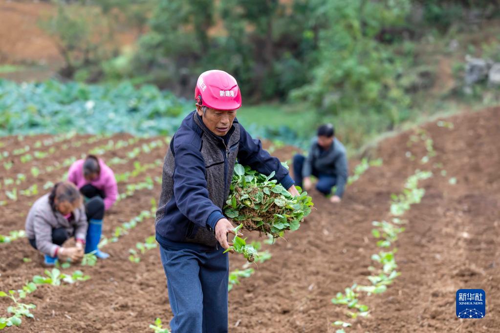 10月8日,村民在貴州省黔西市文峰街道雙星社區栽種油菜。新華社發(范暉 攝)