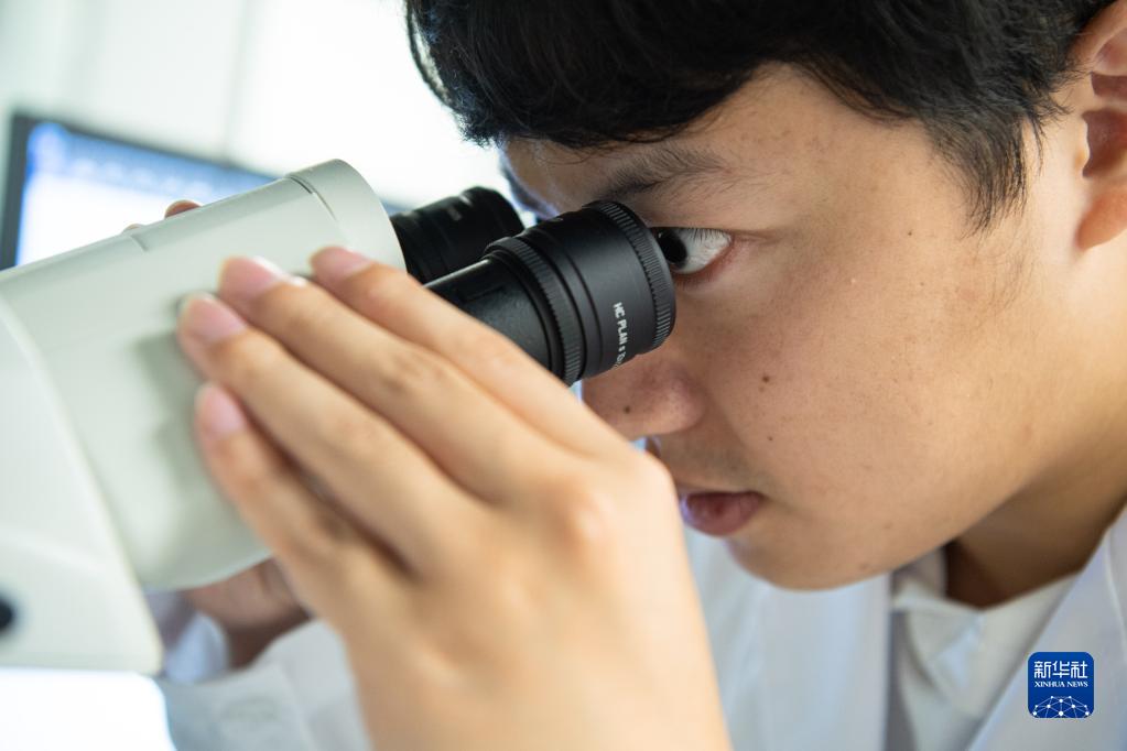 10月6日,“95后”的澳門科技大學月球與行星科學國家重點實驗室博士生劉子博使用光學顯微鏡觀察月球隕石薄片的顯微特征。新華社記者 張金加 攝