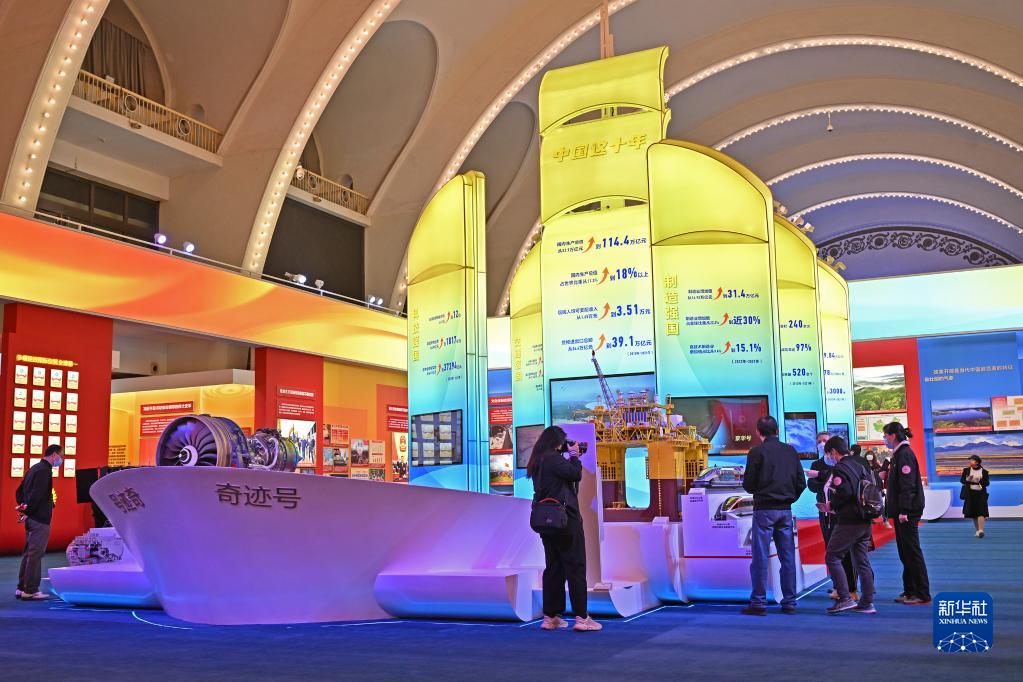 10月8日,一名觀眾在中央綜合展區內參觀拍攝中國經濟“奇跡”號巨輪模型。新華社記者 李鑫 攝