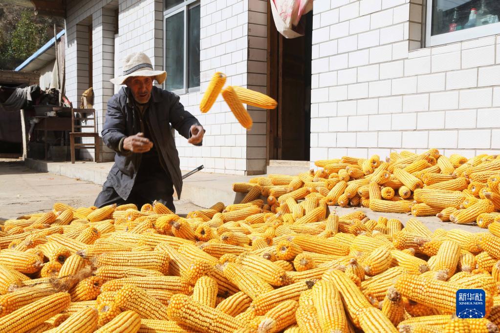 10月9日,甘肅省定西市安定區青嵐山鄉大坪村農民在晾曬玉米。