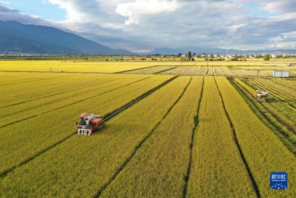 10月8日,工作人員在云南省大理市灣橋鎮水稻綠色種植基地收割水稻(無人機照片)。