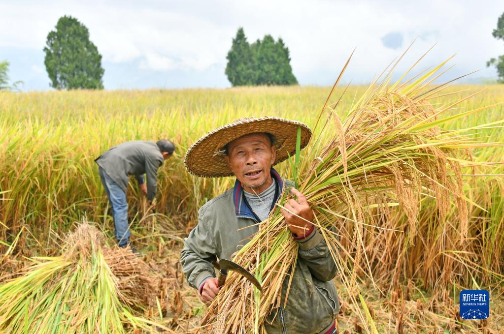 10月9日,在浙江省臺州市仙居縣朱溪鎮楊豐山村,農民在收割稻谷。