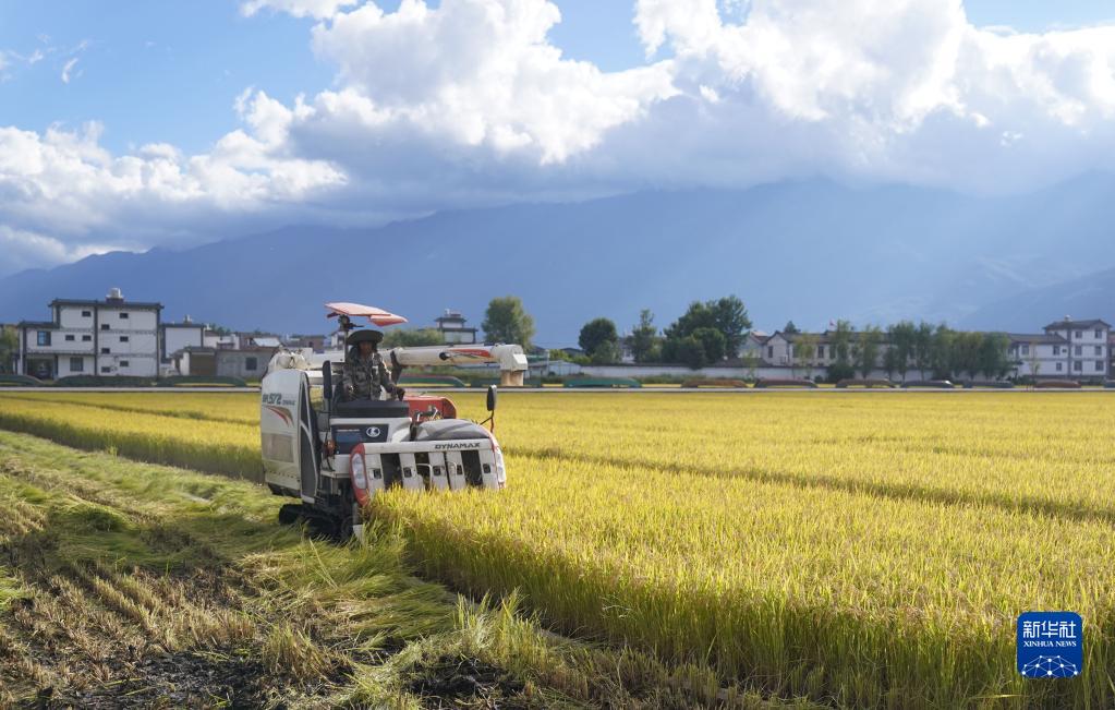 10月8日,工作人員在云南省大理市灣橋鎮水稻綠色種植基地收割水稻。