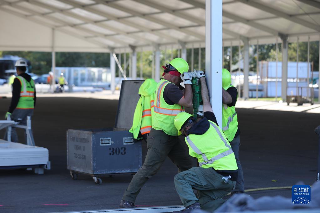 10月9日,工人在位于美國紐約市蘭德爾島的移民救援中心建設工地工作。