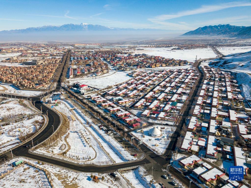 新疆烏魯木齊縣水西溝鎮的一處村莊旁的道路縱橫(2022年1月11日攝,無人機照片)。