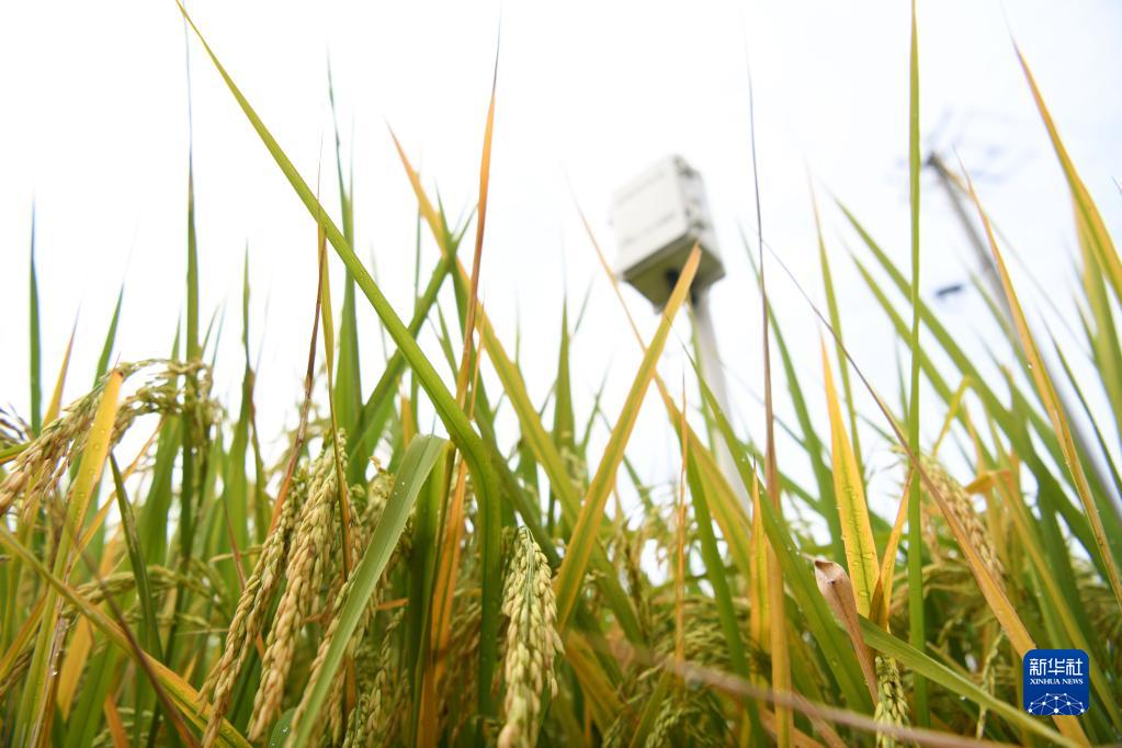 這是蕪湖一農戶稻田里用于監測土壤墑情和田間水位的智能設備(畫面后方),該設備由中聯智慧農業峨橋示范基地提供推廣(10月9日攝)。