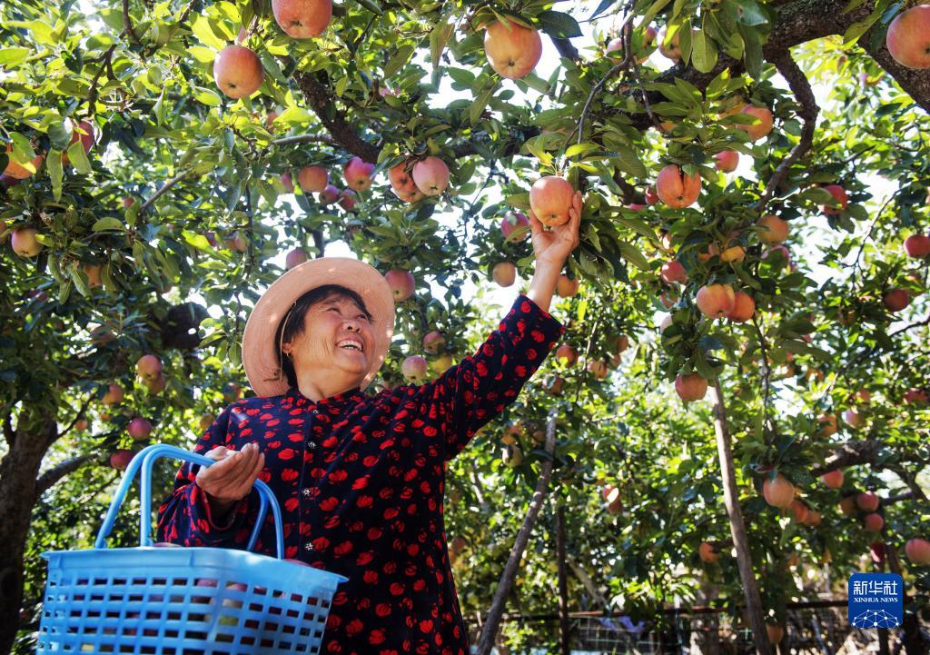 10月8日,山東省膠州市洋河鎮曲家爐村的村民在果園里采收蘋果。