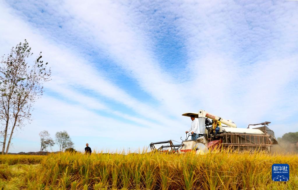 10月10日,在湖南省衡陽市祁東縣河洲鎮,農機手駕駛農機在收割稻谷。
