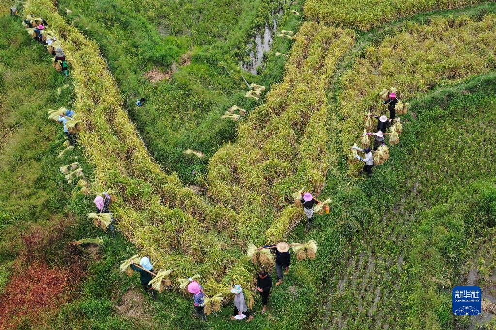10月10日,在貴州省黔東南苗族侗族自治州從江縣剛邊壯族鄉平正村,村民挑運剛收獲的糯稻谷(無人機照片)。