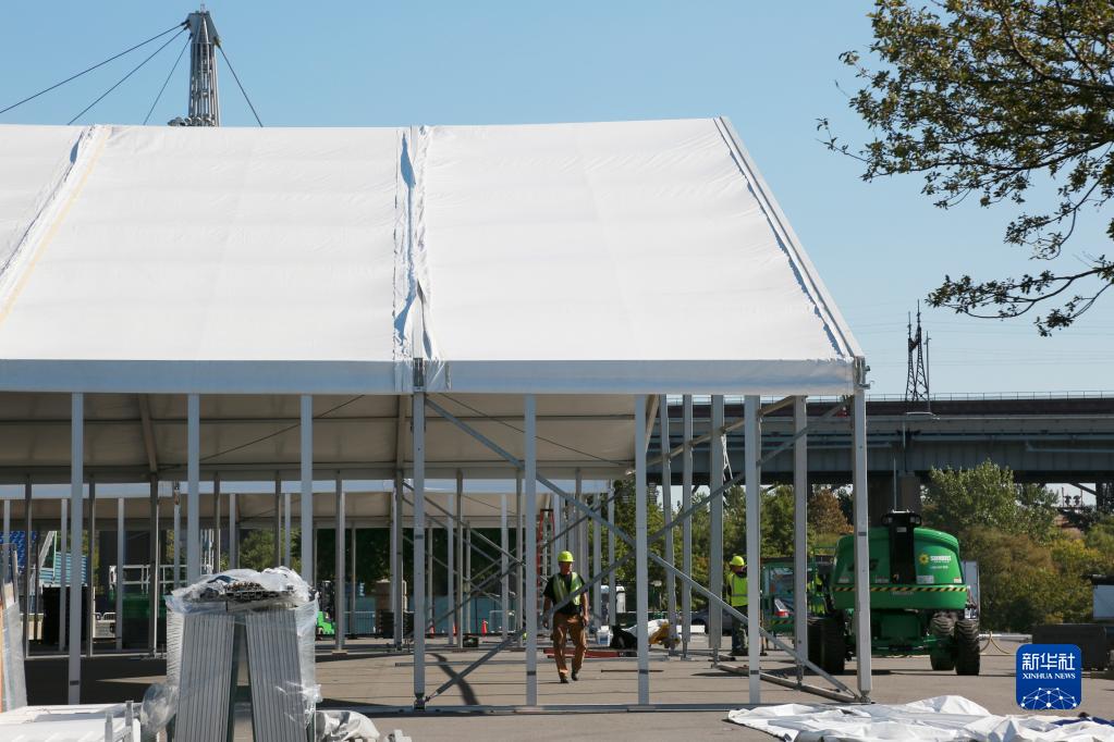 10月9日,工人在位于美國紐約市蘭德爾島的移民救援中心建設工地工作。