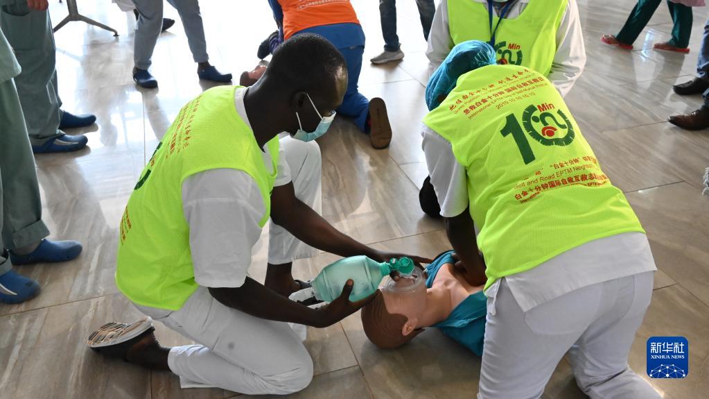 第29批中國援幾內亞醫療隊10日在幾內亞首都科納克里的中幾友好醫院開展急救培訓活動。此次活動主題為“急救白金十分鐘,國際自救互救日”,援幾醫療隊為中幾友好醫院的醫護人員開展了心肺復蘇、海姆立克急救、轉運患者、急診接診等項目的演練和培訓。