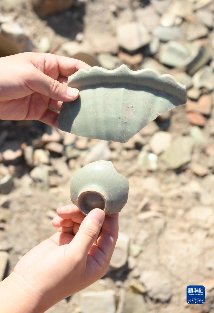 10月10日,考古工作人員在發掘現場展示兩塊青瓷片。