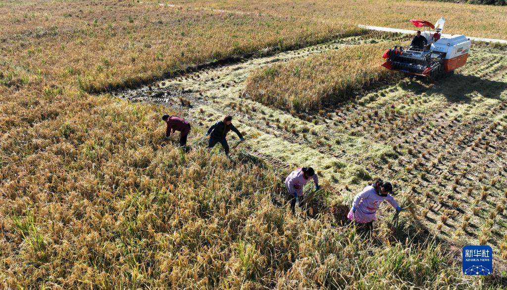 10月11日,農民和收割機在水稻開鐮儀式上收割水稻(無人機照片)。