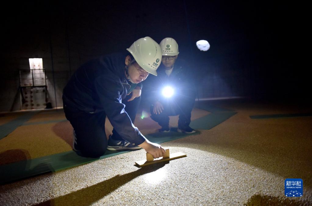 10月11日,中儲糧邢臺倉儲有限責任公司工作人員在淺圓倉內平整糧面。