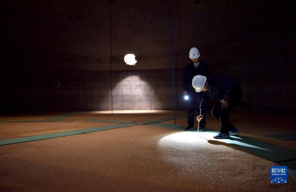 10月11日,中儲糧邢臺倉儲有限責任公司工作人員在淺圓倉內使用探桿查看糧情。