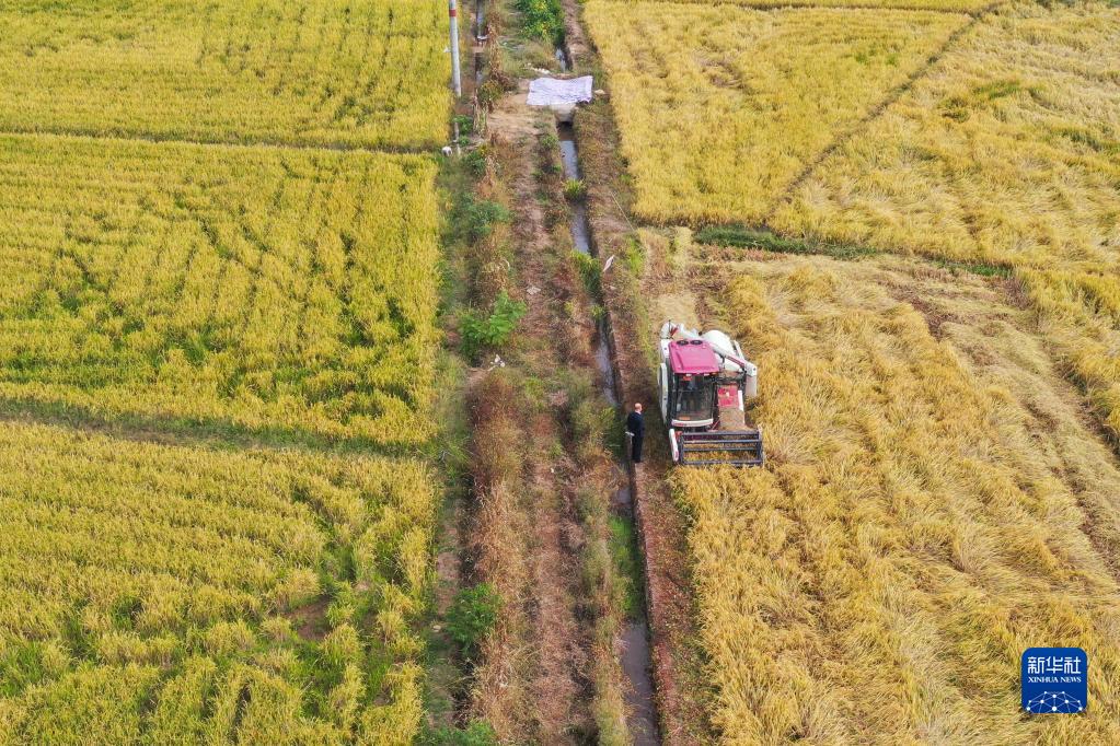 10月11日,工作人員在示范區收割稻谷(無人機照片)。