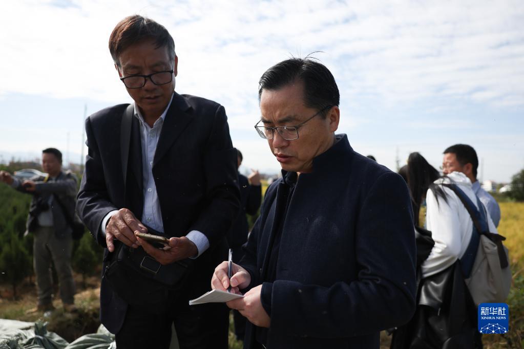 10月11日,工作人員在測產驗收現場記錄稻谷的相關數據。