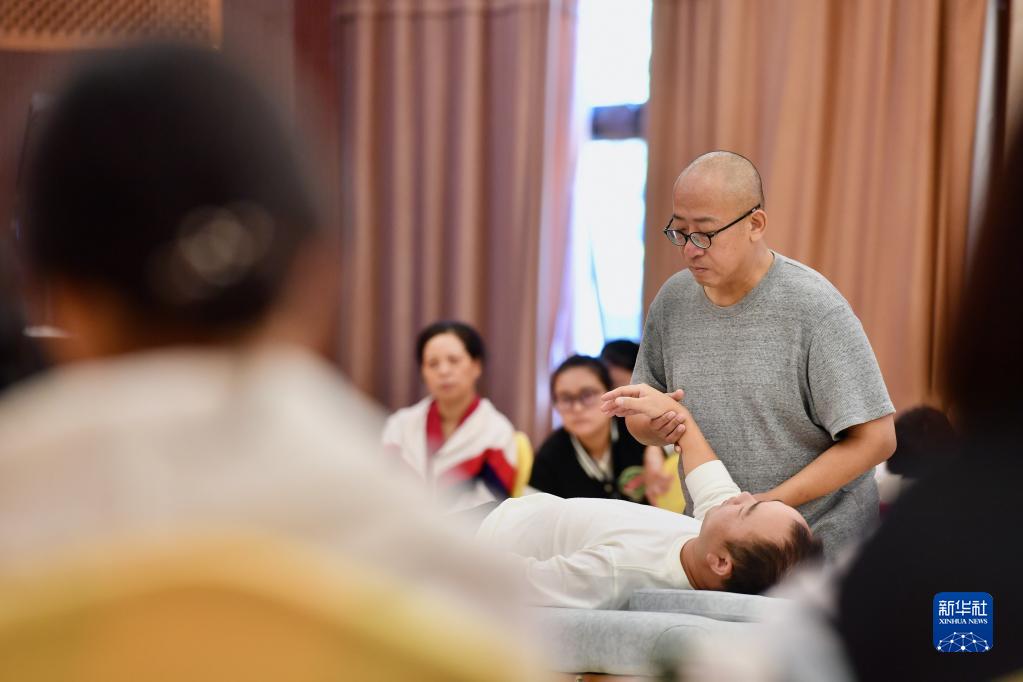 10月11日,在2022年福建省森林康養培訓班上,授課老師在教授身體放松手法。