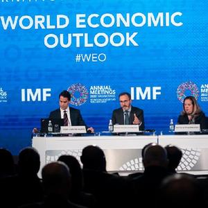 這是10月11日在美國華盛頓拍攝的國際貨幣基金組織(IMF)《世界經濟展望報告》新聞發布會。